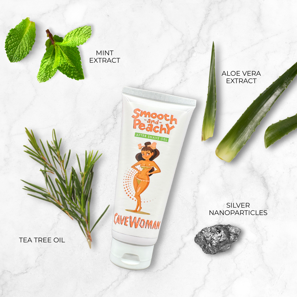 | Applying CaveWoman Smooth & Peachy After Shave Gel after shaving your underarms is a breeze. The silver nanoparticles in the formula ensure irritation is kept at bay, allowing you to enjoy a sleek, hair-free feel. Tea tree oil adds a soothing touch, and aloe vera keeps your underarms fresh and hydrated. Say goodbye to redness and discomfort, and hello to irresistibly smooth underarms. | Elevate your bikini line grooming with CaveWoman. The after-shave gel’s silver nanoparticles provide a protective shield, tea tree oil brings a soothing sensation, and aloe vera ensures hydration. The result? A flawless bikini area that’s not just hair-free but also irresistibly smooth and refreshingly peachy. Dive into beach days with confidence. | Transform your leg-shaving routine into a pampering session with CaveWoman. Silver nanoparticles calm the skin, tea tree oil rejuvenates, and aloe vera ensures lasting hydration. The outcome? Silky smooth legs that invite you to confidently showcase your favorite skirts and dresses. Make every shave a luxurious experience with CaveWoman Smooth & Peachy After Shave Gel. |